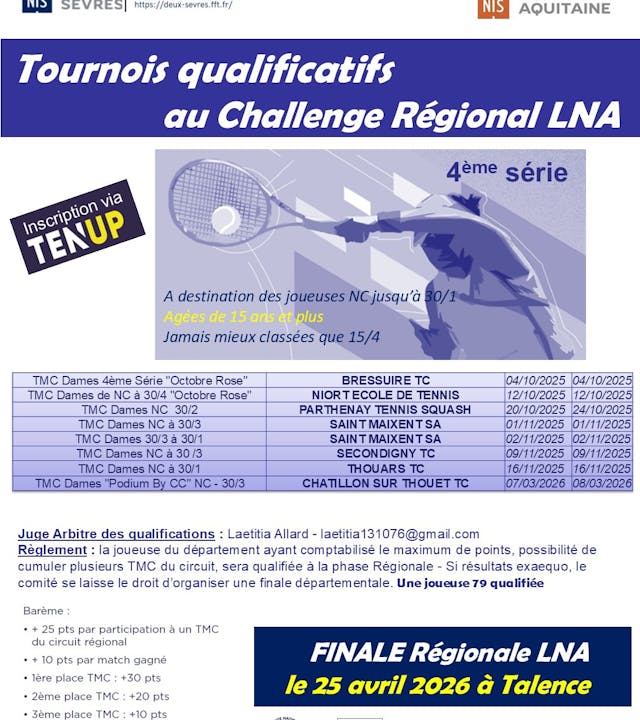 Règlement : la joueuse du département ayant comptabilisé le maximum de points, possibilité de cumuler plusieurs TMC du circuit, sera qualifiée à la phase Régionale - Si résultats exaequo, le comité se laisse le droit d’organiser une finale départementale. Une joueuse 79 qualifiée