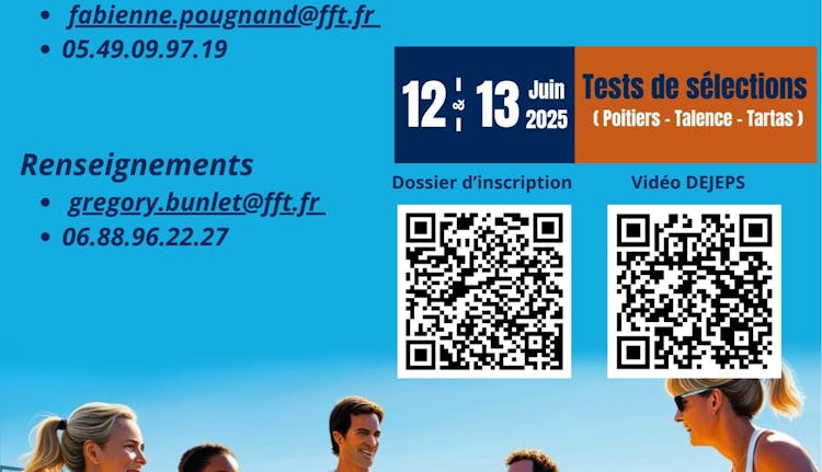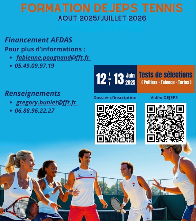 Voici les principales informations concernant la prochaine session de formation au DEJEPS tennis (25 août 2025 > 7 juillet 2026). Les QR codes sur l’affiche vous permettent d’accéder à une vidéo de présentation de la formation ainsi qu’au bulletin d’inscription.