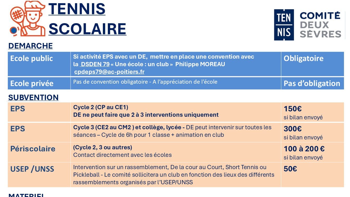 Dans sa politique d’aide aux clubs, le Comité Départemental 79 renouvelle son aide sur les actions menées en direction des écoles primaires, collèges et lycées. Le comité privilégiera les clubs n’ayant jamais fait de demande au préalable et également les projets scolaires qui se dérouleront dans un secteur en zone rurale ainsi que les projets en partenariat avec l’USEP ou UNSS. Depuis 2024, si votre club organise une activité EPS avec un DE, vous devez impérativement mettre en place une convention « Une école : un club » avec la DSDEN 79. contact : cpdeps79@ac-poitiers.fr